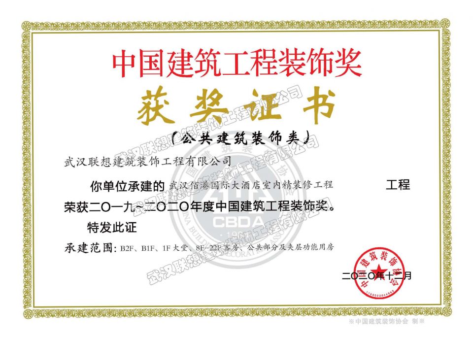 2019-2020年度中國建筑裝飾獎(武漢佰港國際大酒店室內(nèi)精裝修工程)