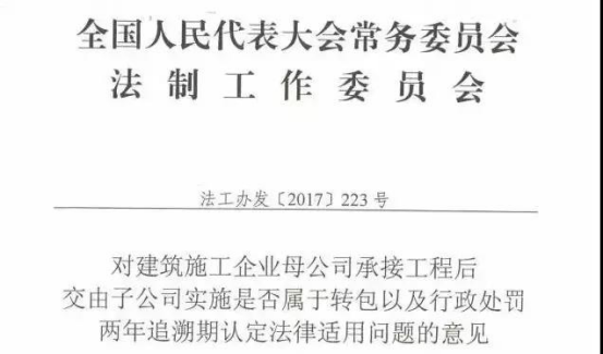 在建筑施工行業(yè),母公司承接工程后交由子公司實(shí)施的情況屢見不鮮,該行為是否應(yīng)認(rèn)定為轉(zhuǎn)包,在業(yè)內(nèi)一直存在不同的說法和認(rèn)識。2017年,住建部曾向全國人大法工委發(fā)出請示函,全國人大法工委作出《對建筑施工企業(yè)母公司承接工程后交由子公司實(shí)施是否屬于轉(zhuǎn)包以及行政處罰兩年追溯期認(rèn)定法律適用問題的意見》(法工辦發(fā)[2017]223號,以下簡稱《意見》)認(rèn)為:關(guān)于母公司承接建筑工程后將所承接工程交由其子公司實(shí)施的行為是否屬于轉(zhuǎn)包的問題...