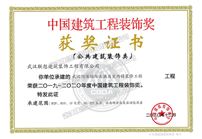 2019-2020年度中國建筑裝飾獎(武漢佰港國際大酒店室內(nèi)精裝修工程)