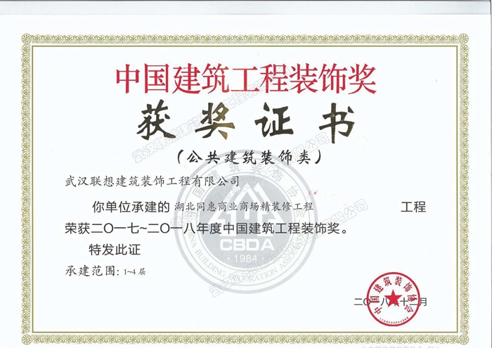 2017-2018年度中國建筑工程裝飾獎(jiǎng)(湖北同惠商業(yè)商場(chǎng)精裝修工程)