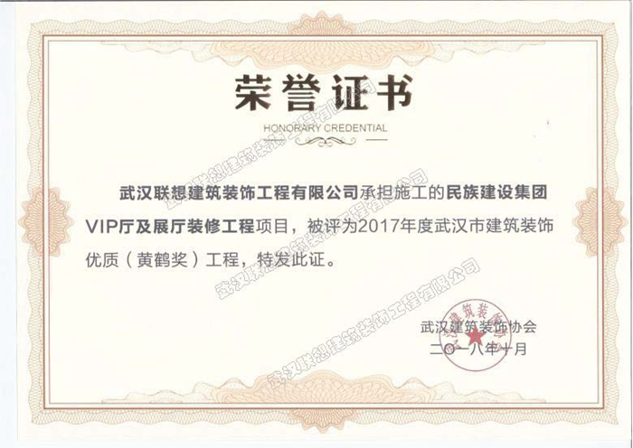 2017年度武漢市建筑裝飾優(yōu)質(zhì)工程黃鶴杯(民族建設(shè)集團(tuán)VIP及展廳裝修項(xiàng)目)
