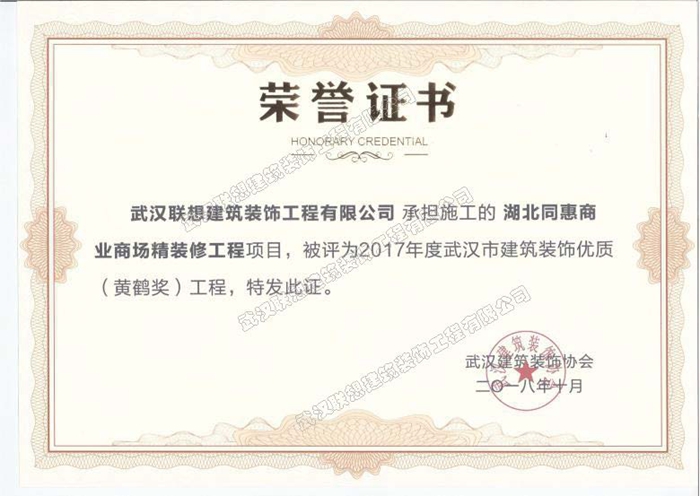 2017年度武漢市建筑裝飾優(yōu)質(zhì)工程黃鶴杯(湖北同惠商業(yè)商場(chǎng)精裝修工程)