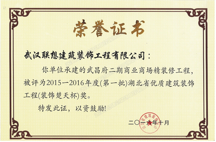 2015-2016年度湖北省優(yōu)質(zhì)建筑裝飾工程楚天杯(武昌府二期商業(yè)商場(chǎng)精裝修工程)