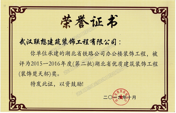 2015-2016年度湖北省優(yōu)質(zhì)建筑裝飾工程楚天杯(湖北省鐵路公司辦公樓裝飾工程)