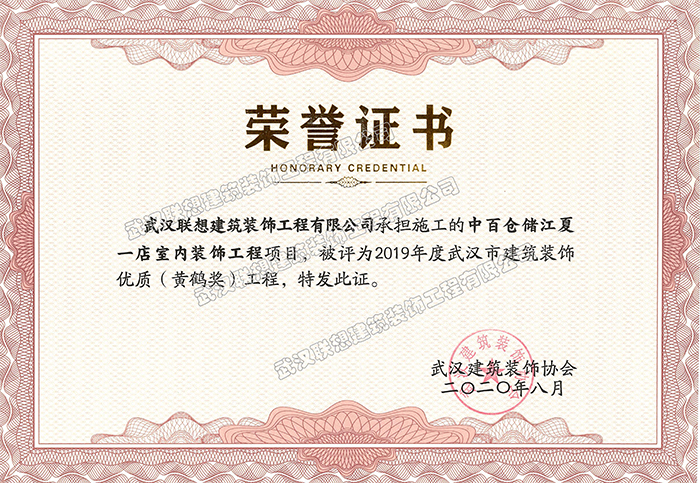2019年度武漢市建筑裝飾優(yōu)質(zhì)工程黃鶴杯(中百倉儲(chǔ)江夏一店室內(nèi)裝飾工程)