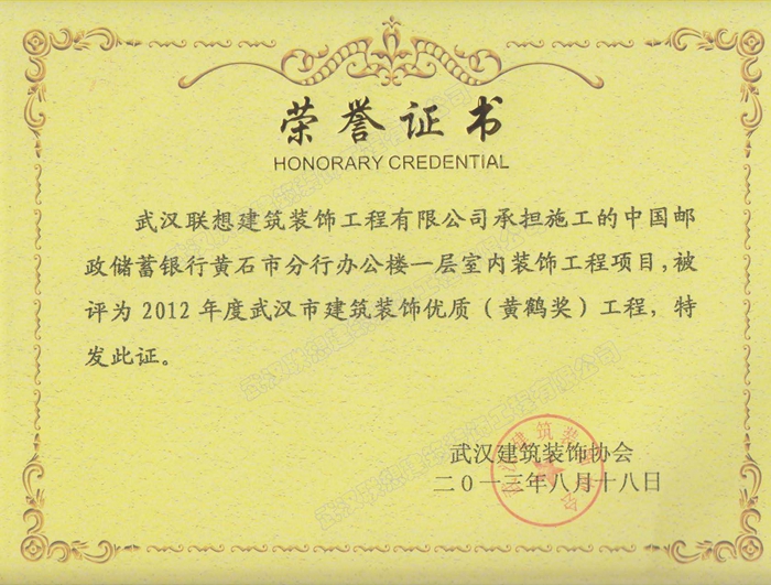 2012年度武漢建筑裝飾優(yōu)質工程黃鶴杯(中國郵政儲蓄銀行黃石市分行室內裝飾工程)