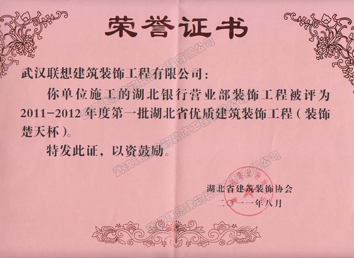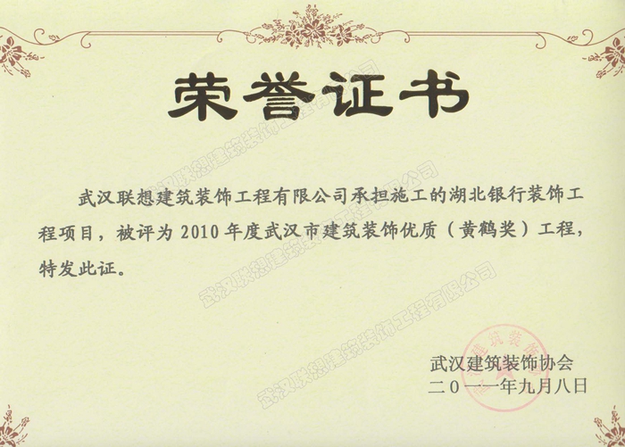 2010年度武漢建筑裝飾優(yōu)質工程黃鶴杯(湖北銀行裝飾工程)