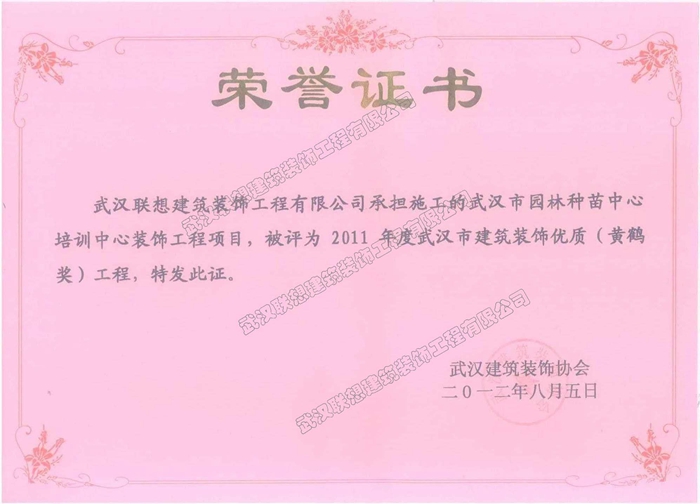 2011年度武漢建筑裝飾優(yōu)質工程黃鶴杯(武漢市園林種苗中心培訓中心裝飾工程)