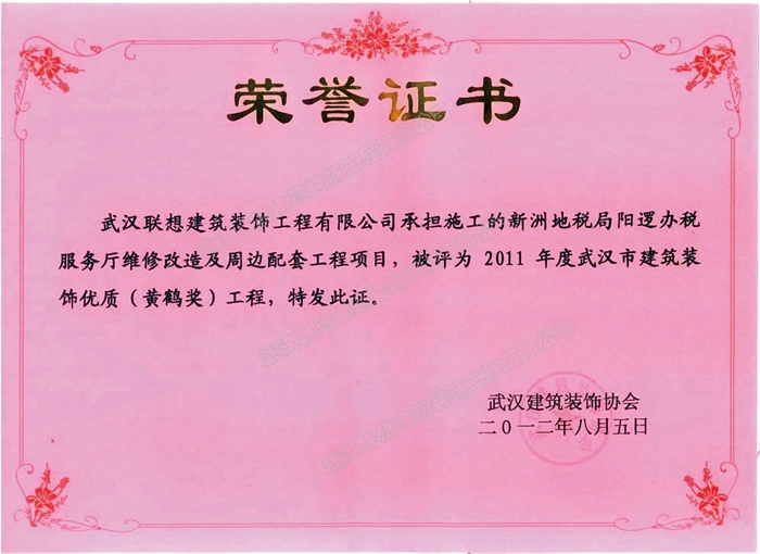 2011年度武漢建筑裝飾優(yōu)質工程黃鶴杯(新洲地稅局陽邏辦稅服務廳維修改造及周邊配套工程)