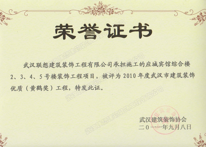 2010年度武漢建筑裝飾優(yōu)質工程黃鶴杯(應城賓館綜合樓2、3、4、5號樓裝飾工程)