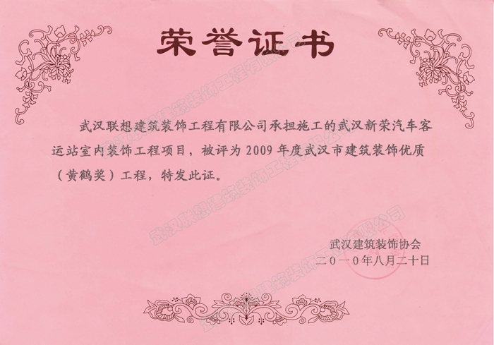 2009年度武漢建筑裝飾優(yōu)質工程黃鶴杯(武漢新榮汽車客運站室內裝飾工程)
