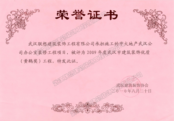 2009年度武漢建筑裝飾優(yōu)質工程黃鶴杯(中大地產武漢公司辦公室裝修工程項目)