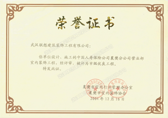 2004年度武漢建筑裝飾優(yōu)質工程黃鶴杯(中國人壽保險公司襄樊分公司營業(yè)部室內裝飾工程)
