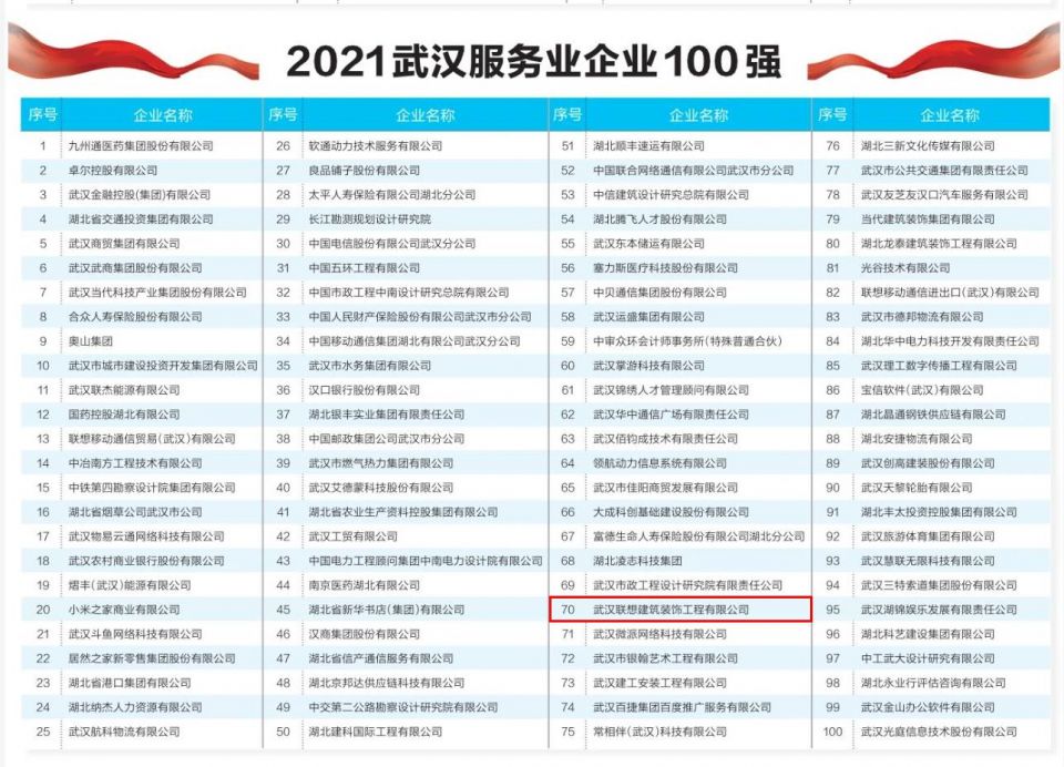 近日,武漢企業(yè)聯(lián)合會發(fā)布“2021武漢服務業(yè)企業(yè)100強”企業(yè)名單,武漢聯(lián)想建筑裝飾工程有限公司成功入選,這是聯(lián)想全體人員拼搏奮斗的榮譽,我們會再接再厲,再創(chuàng)輝煌,取得更驕傲的成績!