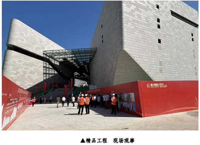 與會(huì)代表不僅在會(huì)場(chǎng)上思想碰撞、坐而論道,還近距離參觀了由德才股份承建青島博物館擴(kuò)建工程項(xiàng)目。該項(xiàng)目總投資5.69 億元,建筑面積 5.5 萬方,項(xiàng)目團(tuán)隊(duì)圍繞“魯班獎(jiǎng)”項(xiàng)目目標(biāo)深耕管理、科技創(chuàng)新、文明施工,匠心打造精品工程。